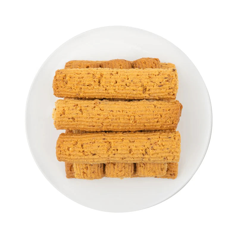 Le Biscuit , ou appelé encore Bachkoutou, croquant et délicieux, garni de noisette , il se déguste au petit déjeuner ou au goûter avec une tasse de café ou un jus. Ingrédients : Farine de blé, noisette (20%), sucre, œuf, amidon de maïs, margarine, huile de maïs, sucre vanille, levure chimique Valeur nutritive pour 100g : Énergie 470kcal (1966Kj), matières grasses 29g (dont Acides gras saturés 3.5g), glucides 48g (dont sucres 15g), protéines 7g, sel 0.4g Allergènes : gluten, œuf, fruits à coque. Peut contenir des traces d'arachide, soja, lait, sésame, sulfite .